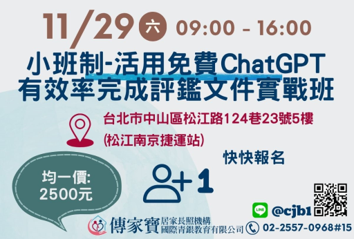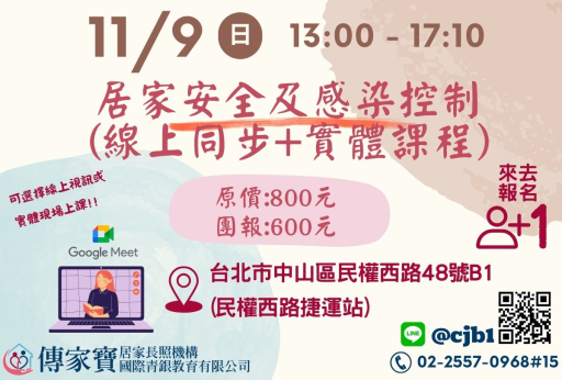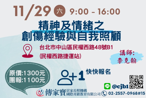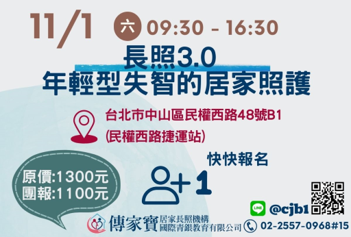 12 長照專業課程10/11 原住民族與多元族群文化敏感度及能力(線上同步課程)最低開課人數 : 15限額 200 名報名截止日:2025/10/08長照專業課程10/12 淺談精神行為(線上同步課程)最低開課人數 : 15限額 50 名報名截止日:2025/10/08長照專業課程10/18三高ByeBye 控制三高-飲食及照顧攻略最低開課人數 : 15限額 50 名報名截止日:2025/10/16長照專業課程10/19 原住民族與多元族群文化敏感度及能力最低開課人數 : 15限額 80 名報名截止日:2025/10/16長照專業課程10/19 消防安全、緊急應變、性別敏感度課程最低開課人數 : 15限額 80 名報名截止日:2025/10/16長照專業課程10/26 BA04管灌餵食+BA24腸胃造口照護技巧與實作最低開課人數 : 15限額 50 名報名截止日:2025/10/22長照專業課程10/29 原住民族文化敏感度及能力課程(線上同步課程)最低開課人數 : 15限額 200 名報名截止日:2025/10/28長照專業課程11/1 長照3.0 -年輕型失智的居家照護最低開課人數 : 15限額 50 名報名截止日:2025/10/30長照專業課程11/2 中風後居家復能與照顧實用重點最低開課人數 : 15限額 50 名報名截止日:2025/10/30長照專業課程11/8 原住民、多元、消防、緊急、感控課程(長照人員必修五合一課程)最低開課人數 : 15限額 80 名報名截止日:2025/11/06長照專業課程11/9 異常(緊急)事件防治(線上同步+實體課程)最低開課人數 : 15限額 80 名報名截止日:2025/11/06長照專業課程11/9 居家安全及感染控制(線上同步+實體課程)最低開課人數 : 15限額 80 名報名截止日:2025/11/06長照專業課程11/15、16 失智症照顧服務20小時訓練課程最低開課人數 : 15限額 50 名報名截止日:2025/11/13長照專業課程11/17 多元族群文化敏感度及能力(線上同步課程)最低開課人數 : 15限額 200 名報名截止日:2025/11/16長照專業課程11/22、23 身心障礙支持服務核心課程最低開課人數 : 15限額 50 名報名截止日:2025/11/20長照專業課程11/29 小班制-活用免費ChatGPT有效率完成評鑑文件實戰班最低開課人數 : 7限額 10 名報名截止日:2025/11/27長照專業課程11/29 精神及情緒之創傷經驗與自我照顧最低開課人數 : 15限額 50 名報名截止日:2025/11/27長照專業課程11/30 原住民、感控、消防、緊急、多元課程(長照人員必修五合一課程)(線上同步課程)最低開課人數 : 15限額 200 名報名截止日:2025/11/27長照專業課程11/30 CPR+AED積分證照班最低開課人數 : 15限額 60 名報名截止日:2025/11/24長照專業課程11/30 藝術輔療最低開課人數 : 15限額 50 名報名截止日:2025/11/27 12