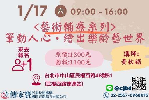 12 長照專業課程1/10、11 身心障礙支持服務核心課程最低開課人數 : 15限額 50 名報名截止日:2026/01/08長照專業課程1/17 <藝術輔療系列>筆動人心‧繪出樂齡藝世界最低開課人數 : 15限額 50 名報名截止日:2026/01/15長照專業課程1/18 異常(緊急)事件防治(線上同步+實體課程)最低開課人數 : 15限額 80 名報名截止日:2026/01/15長照專業課程1/18 居家安全及感染控制(線上同步+實體課程)最低開課人數 : 15限額 80 名報名截止日:2026/01/15 12