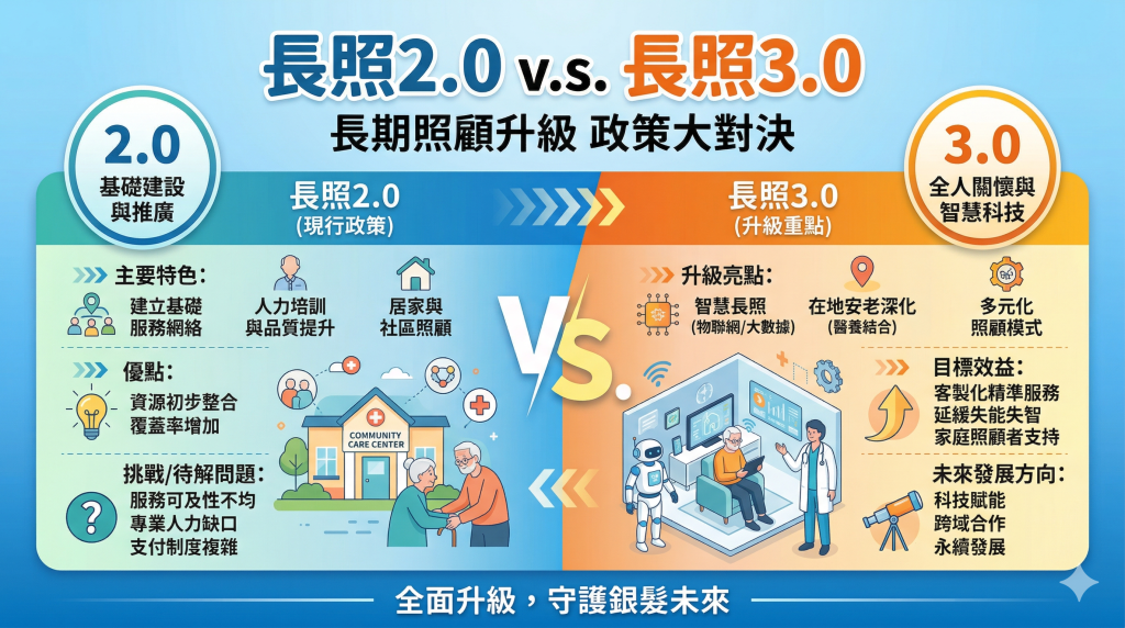什麼是長期照顧服務?怎麼申請?2026/03/25長照 3.0 分階段上路,和 2.0 差在哪?2025/11/03長照 3.0 是什麼?2025/04/30長照3.0明年啟動 衛福部詳細規劃年中提報行政院2025/03/15「長照平安五守則」 提供家庭照顧者「照顧救生圈」2025/03/12社區整體照顧服務體系2025/03/12家庭照顧者支持服務相關公告2025/03/03傳家寶居服同業合作新模式: 居服員年度技術考核2025/02/21照顧服務人員落實先登錄再接受特殊訓練宣導圖文2025/01/17蔡雪泥基金會捐贈全新輔具 支援輔具需求者提升生活品質2024/09/27不再怕突然動不了,不用「清晨4點起床穿衣」!深腦刺激術如何翻轉巴金森病友生活? 2024/09/24瘦子也會養出「肝包油」?醫生:喝高兒茶素綠茶能改善脂肪肝2024/09/24失智能逆轉?腦科學家揭6招建「大腦備援」 終生不失智關鍵2024/09/20聘僱外看家庭可使用長照服務2024/07/11出院準備銜接長照服務2024/07/11減少住宿型機構住民至醫療機構就醫2024/07/05失智症照護與服務資源2024/07/02輔具租借、購買及居家無障礙環境改善2024/07/02